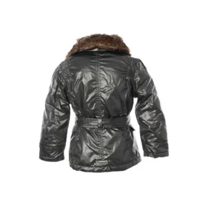 Stoer, kek kort jasje in trenchcoatmodel. De bontkraag is afneembaar.Sluit met een rits, en drukknopen, en kan dichtgeknoopt worden met een ceintuur.De jas heeft een matte laklaag, waardoor deze ook goed tegen regen kan ! (NB hij glimt dus niet zo erg als op de foto !)De jas heeft een warme thermische voering dus is een heerlijke warme winterjas voor je kind.