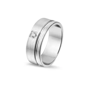 Zilveren matte gerhodieerde ringen voor beide. In de ring voor haar zit een briljant 0.03 - diamant - round briljant cut - colour F - quality Si 3 met certificaat. Breedte ringen 7 mm.